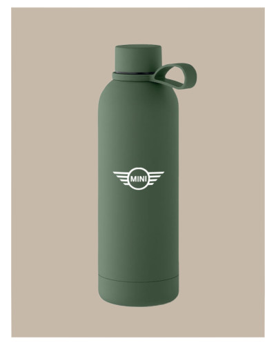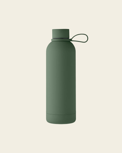 Bouteille isolante sous vide à double paroi en acier inoxydable recyclé (90 % d'acier inoxydable recyclé et 10 % d'acier inoxydable) avec finition en caoutchouc et poignée en silicone. Anti fuite. Capacité : 500 ml.