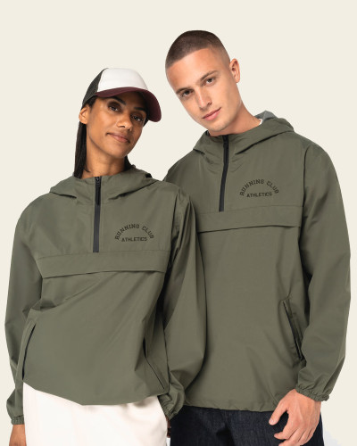 100% polyester recyclé post-consumer. Coupe standard. Tissu contrecollé 2 couches avec membrane intérieure et coutures thermo-soudées pour une imperméabilité optimale. Imperméable 4000mm. Respirant 3000 g/m²/24h. Milieu devant avec quart de zip imperméable recyclé. Poche poitrine traversante avec rabat et deux poches côtés passepoilées avec zip inversé. Deux œillets d’aération sous le rabat de la poche devant. Capuche 3 panneaux. Cordon de serrage avec stoppeurs recyclés à l’intérieur de la capuche et au bas du vêtement côté gauche au porté. Bas de manches élastiqués.
